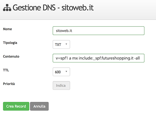 - Contenuto: v=spf1 a mx include:_spf.futureshopping.it -all