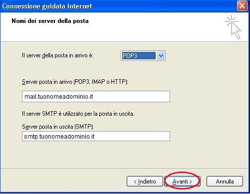 Inserire di seguito i nomi dei server della posta in entrata e di quella in uscita: nel menù a tendina in alto "Il server della posta in arrivo è: " selezionare ad esempio il server POP3, nel campo "Server posta in arrivo" indicare mail.tuosito.it; nel campo "Server posta in uscita (SMTP)" si dovrà indicare l'SMTP del provider dal quale si effettua la connessione o, in alternativa, smtp.tuosito.it. Cliccare sul pulsante "Avanti"