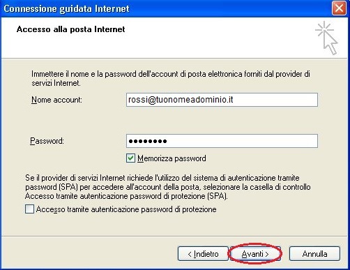 Nella finestra successiva inserire il nome dell'indirizzo di posta (es. rossi@tuonomeadominio.it), la relativa password, spuntare l'opzione "Memorizza Password" ed infine cliccare "Avanti".