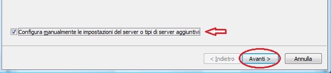 Nella finestra di Configurazione automatica account mettere la spunta sulla voca in basso "Configura manualmente le impostazioni del server o tipi di server aggiuntivi" e cliccare "Avanti".