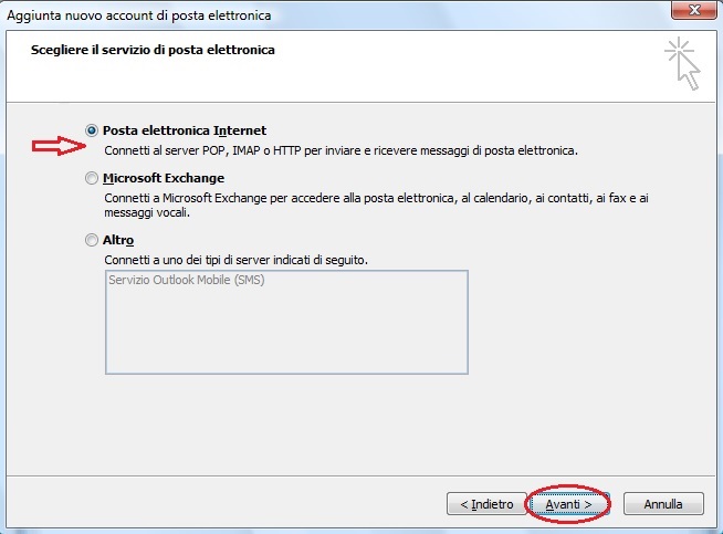 Tra le tre opzioni che appaiono, selezionare la prima, "Posta elettronica Internet", e successivamente cliccare su 'Avanti'