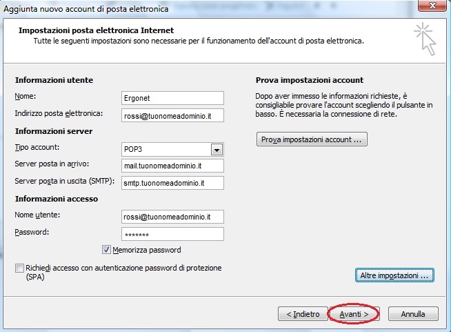 - le Informazioni server: come Server di posta in arrivo scrivere mail.tuosito.it e come Server di posta in uscita (SMTP) si dovrà indicare l'SMTP del provider dal quale ci si connette o, in alternativa, inserire smtp.tuosito.it. Infine cliccate "Avanti".
