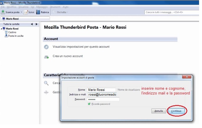 Inserire di seguito il nome che comparirà come mettiente delle e-mail che saranno inviate dall'account, l'indirizzo di posta, la password, mettere la spunta su "Ricorda password" ed infine cliccare su "Continua"