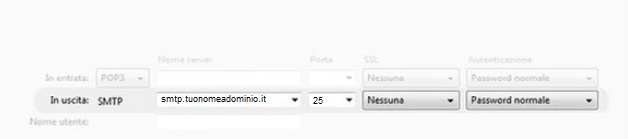 Per posta in uscita selezionare "SMTP" nel menu a tendina del protocollo, inserire come nome server l'smtp del prorpio provider di connettività o, in alterntiva, smtp.tuosito.it, indicare la Porta 25, nel menu di SSL selezionare "Nessuna" e dal menu Autenticazione scegliere "Password normale". Subito sotto, nel campo "Nome Utente" inserire l'indirizzo email per il quale si sta configurando l'account (es rossi@tuonomeadominio.it).