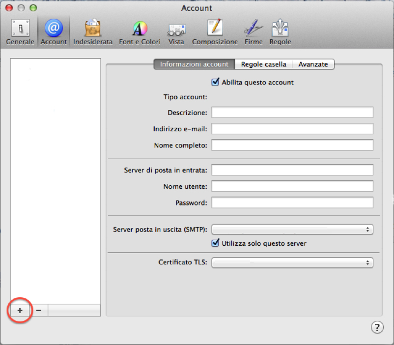 a questo punto per procedere con la creazione di un nuovo account cliccare sul tasto “+” cerchiato in rosso nell’immagine. Si aprirà una procedura guidata per la creazione della mail.