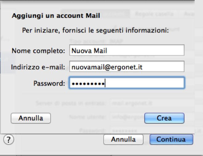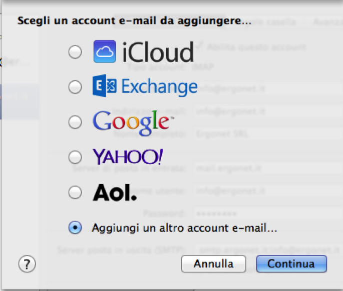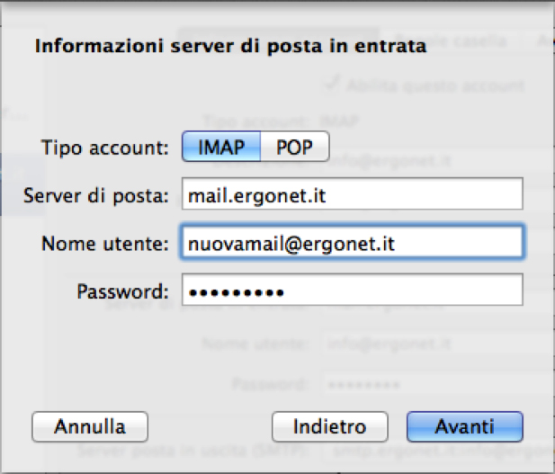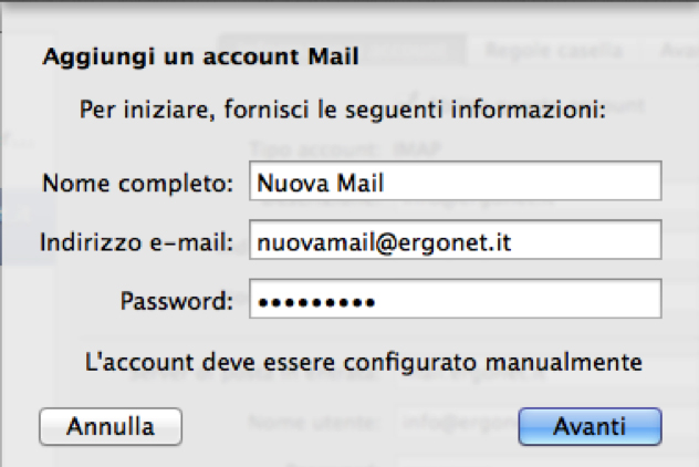 A questo punto Mail avvertirà della necessità di impostare l’account manualmente, selezionare dunque il tasto “Avanti” con il quale si accederà alla schermata per inserire le configurazioni per la mailbox, questi sono reperibili nella mail di conferma attivazione.