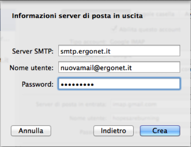 Inserite ora le informazioni riguardanti il server di posta in uscita: in questo caso potrete utilizzare i server del vostro fornitore di connettività (le cui impostazioni andranno richiesta direttamente al provider) oppure utilizzare le impostazioni di uno dei nostri servizi SMTP. Sia che sia attiva l’opzione SMTP Autenticato o che si usi il nostro SMTP gratuito le impostazioni da inserire saranno le medesime, server SMTP smtp.tuosito.it, il nome utente che deve essere la mailbox completa e la relativa password. Cliccare dunque su "Crea" per terminare la procedura guidata.