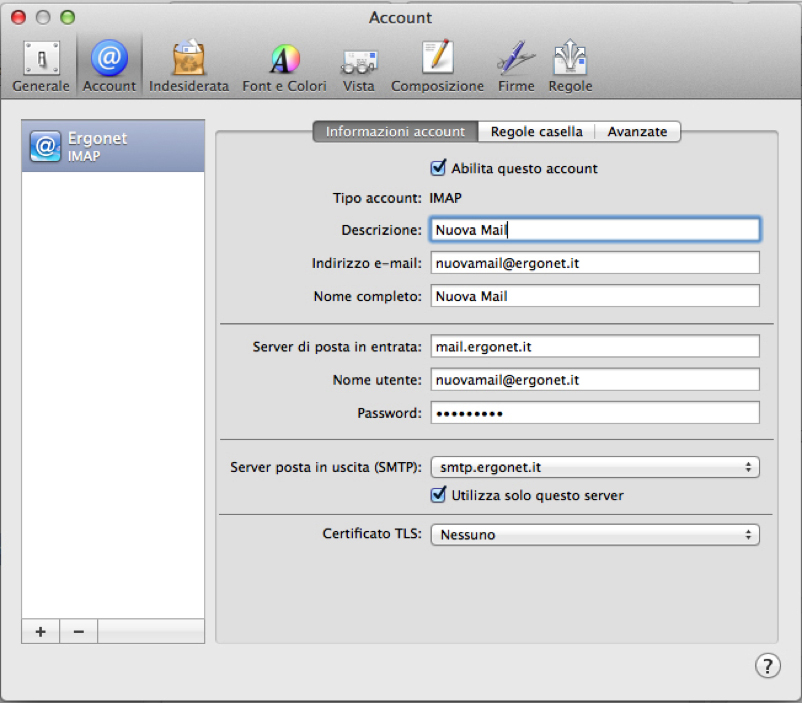 Infine viene visualizzato il pannello delle preferenze in cui sarà presente, sulla sinistra, la casella appena creata.